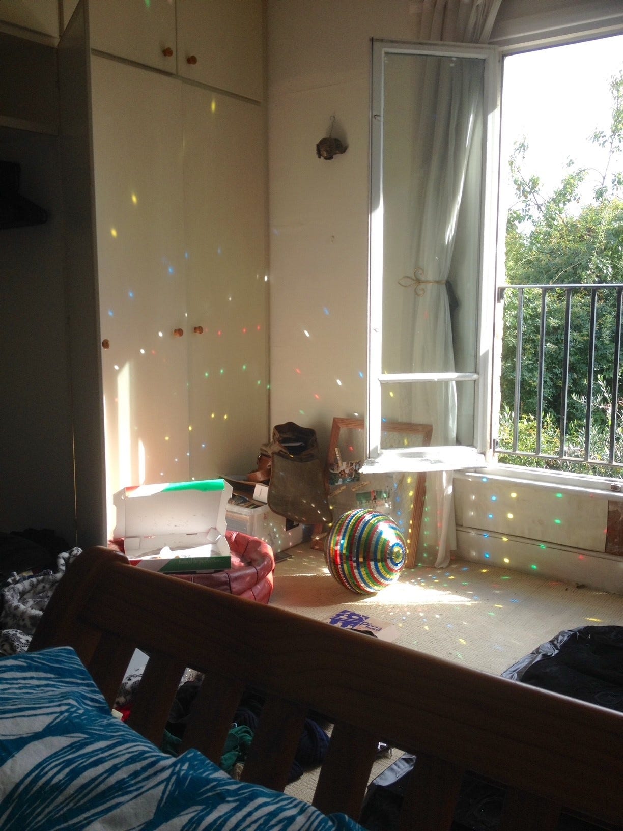 I asked the nonplussed seller behind the counter if the disco ball was for sale, upon which he peered up with the air of a man who had, until that very moment, forgotten the twisting world of colour above our heads had existed at all. It had been there so long, he said, that he didn’t know if it was for sale or indeed where it had appeared from. He gamely fetched a rickety stepladder and, brandishing an old toothbrush, gently worried away the dust and grime that had settled upon its surface. 10 minutes later, £20 lighter, I stepped out into the world, arms clasped around an object that seemed to me to encapsulate that very time of life; a tumult of sparkle and uncertainty, where I teetered on the precipice of adulthood, buoyed by the joy of first love and new beginnings.